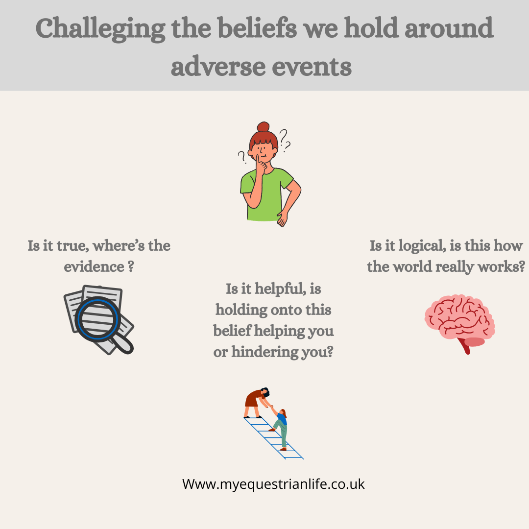 If you have a goal something you are working towards you will enviably face some adversity. We can’t achieve anything significant without there being some ups and downs. However, as this quote by Marcus Aurelius reminds us, it’s not the adverse event that that guides our behaviour but the beliefs we have around it. For example, we might say to ourselves ‘I did terribly in that dressage test, I’m obviously not good enough’ or ‘I’m not going to compete at that venue, everyone will think I’m not good enough to be there’. For this reason, it’s important that we develop an awareness of the beliefs we hold and if necessary challenge them. For this we can ask ourselves three questions;
